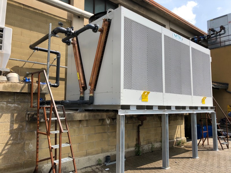 The system is water-cooled via a high efficient Mita evaporative condenser which operates with adiabatic method. Aerodynamic type of fan blades are used which minimize energy input from the motors. The motors are directly coupled in the fans minimizing moving components (less maintenance). Mita electronic management system controls condensing temperature and pressure, by continuous calibration of fan speed and water consumption.